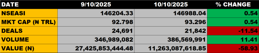 The All Share Index grew further by 0.54% to close at 146,988.04 points from Monday’s close of 146,204.33 points.