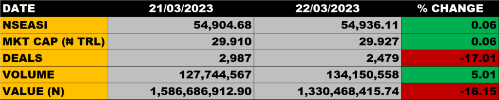 Investors gained N17 billion as the Market Capitalisation grew by 0.06% to close at N29.927 trillion from the previous close of N29.910 trillion.
