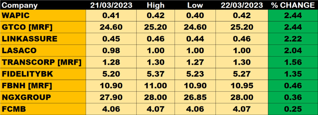 WAPIC and GTCO led other gainers with 2.44% growth each, closing at N0.42 and N25.20 from the previous close of N0.41 and N24.60 respectively.