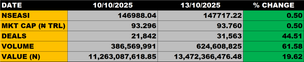 The Nigerian stock market extended its positive momentum to 12th consecutive sessions ahead of the Q3’25 earnings season as the All Share Index closed 0.50% higher to settle at 147,717.22 points from the previous close of 146,988.04 points.