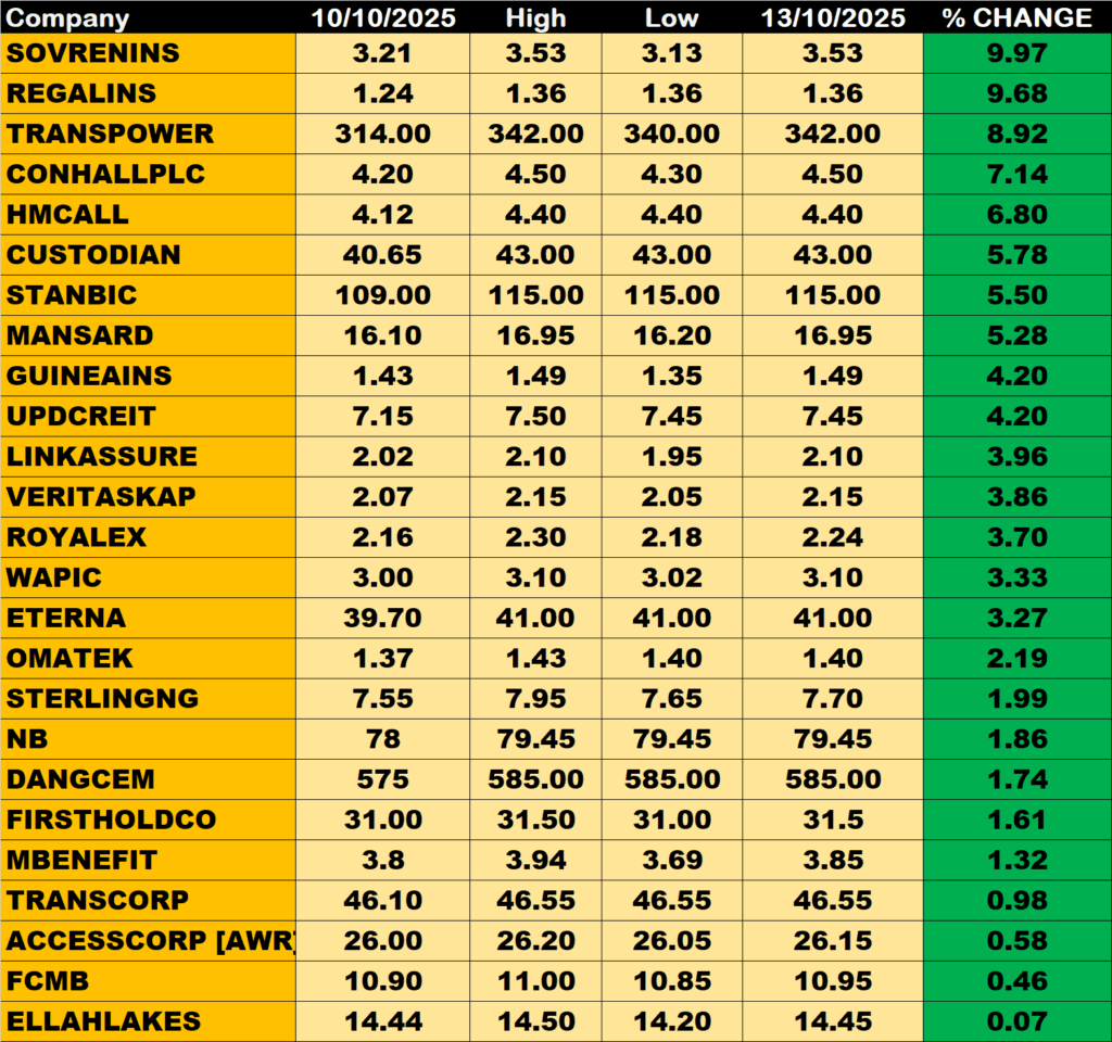 Sovereign Trust Insurance led other gainers with 9.97% growth to close at N3.53 from the previous close in N3.21.
