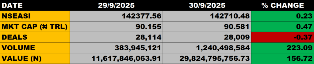 The All Share Index grew by 0.19% to close at 142,979.46 points from the previous close of 142,710.48 points.