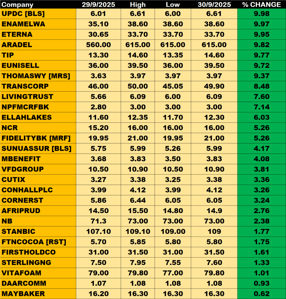 ETERNA, Champion Breweries and Tantalizer among other gainers also grew their share prices by 9.94%, 9.82% and 5.96% respectively.