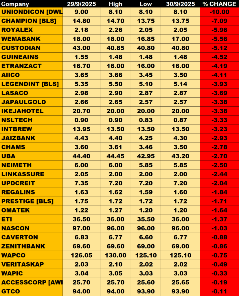 THOMASWYAT and Sovereign Trust Insurance among other price decliners also shed their share prices by 9.82% and 9.33% respectively.