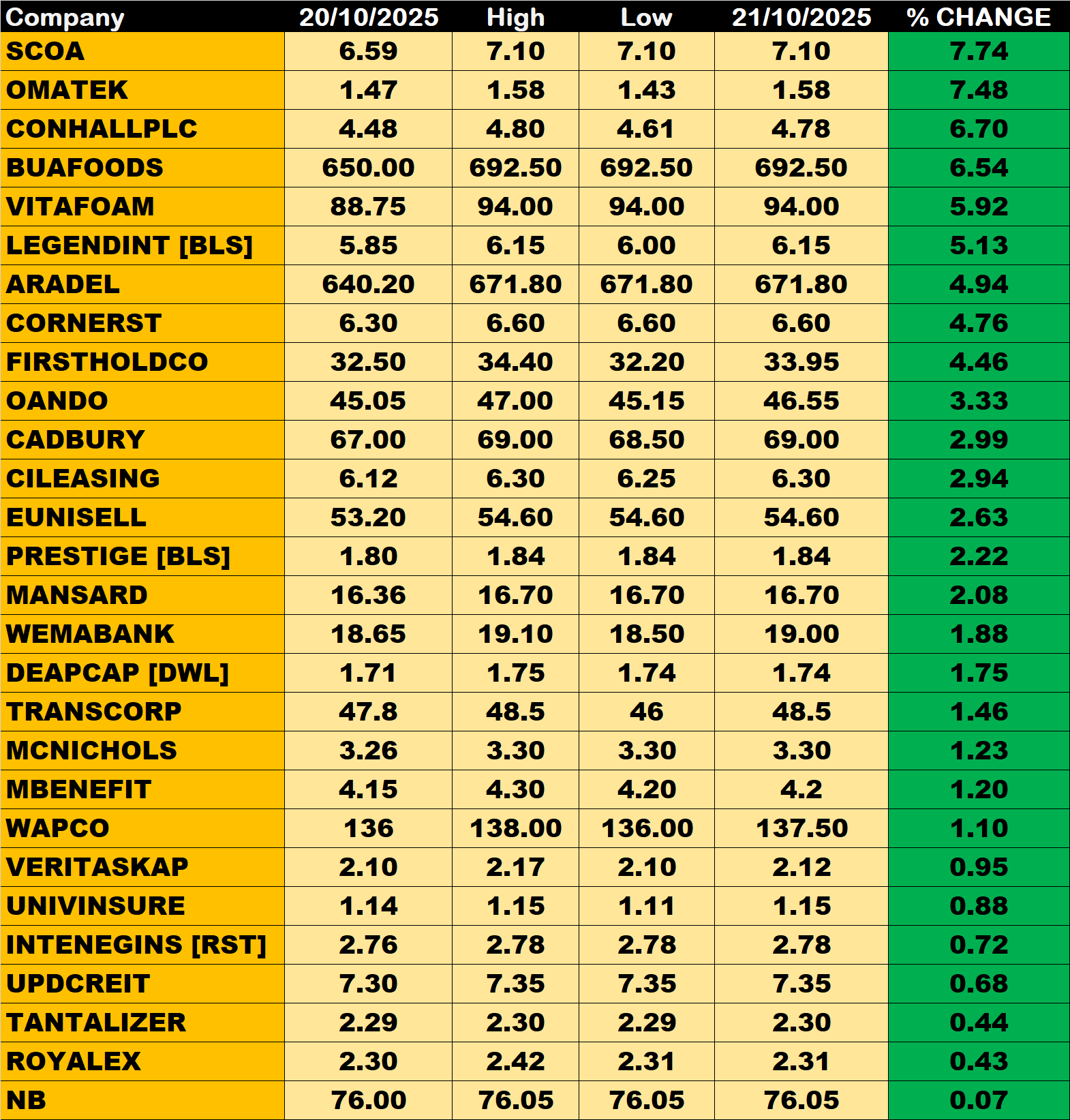 SCOA led other gainers with 7.74% growth to close at N7.10 from the previous close of 6.59.