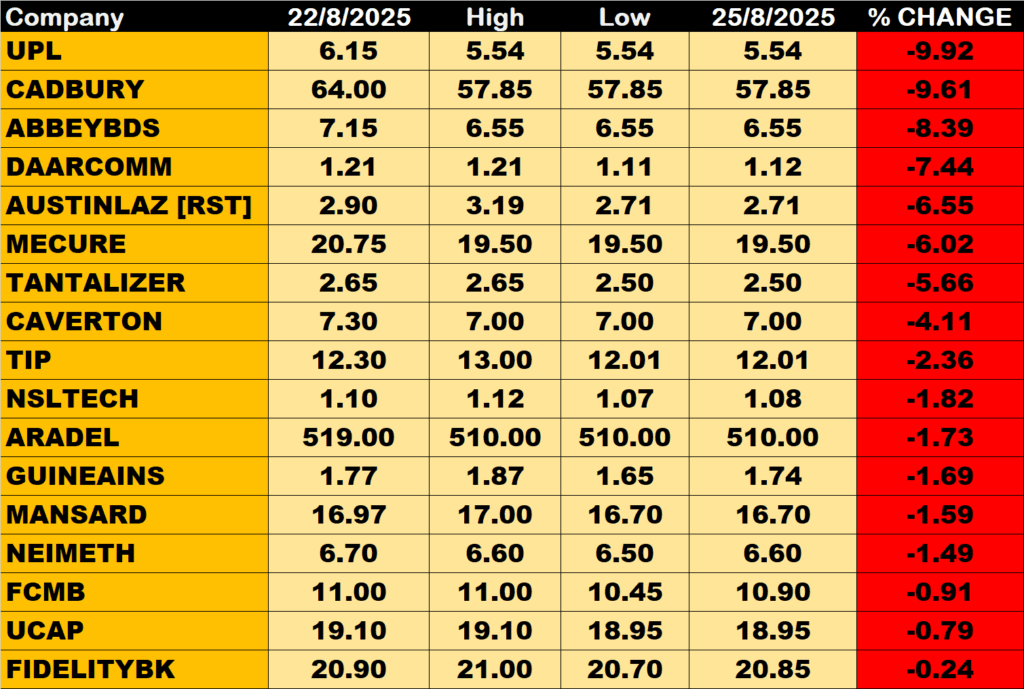 CADBURY and ABBEY BUILDING among other price decliners also shed their share prices by 9.61% and 8.39% respectively.