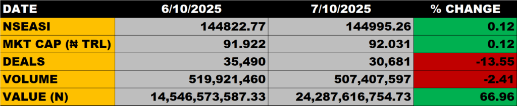 The Market Capitalisation appreciated by 0.12% to close at N92.031 trillion from the previous close of N91.922 trillion, thereby gaining N109 billion.
